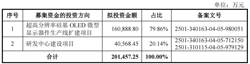 本次募集资金超过20亿元,投资项目为超高分辨率硅基OLED微型显示器件生产线扩建项目与研发中心建设项目。