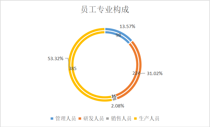 报告期各期末,员工人数合计分别为747人、786人、715人及722人。截至2025年6月30日,公司员工专业构成的具体情况如下:管理人员98人,占比13.57%;研发人员224人,占比31.02%;销售人员15人,占比2.08%;生产人员385人,占比53.32%。